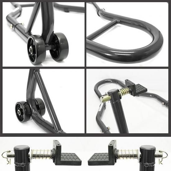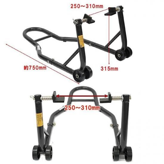 モーターサイクル フロントスタンド リアスタンド 2台 セット 高さ 固定式 黒 耐荷重 320kg ステム 6サイズ アタッチメント L型 傷防止 保護パッド付 タイヤ フロントフォーク 交換
