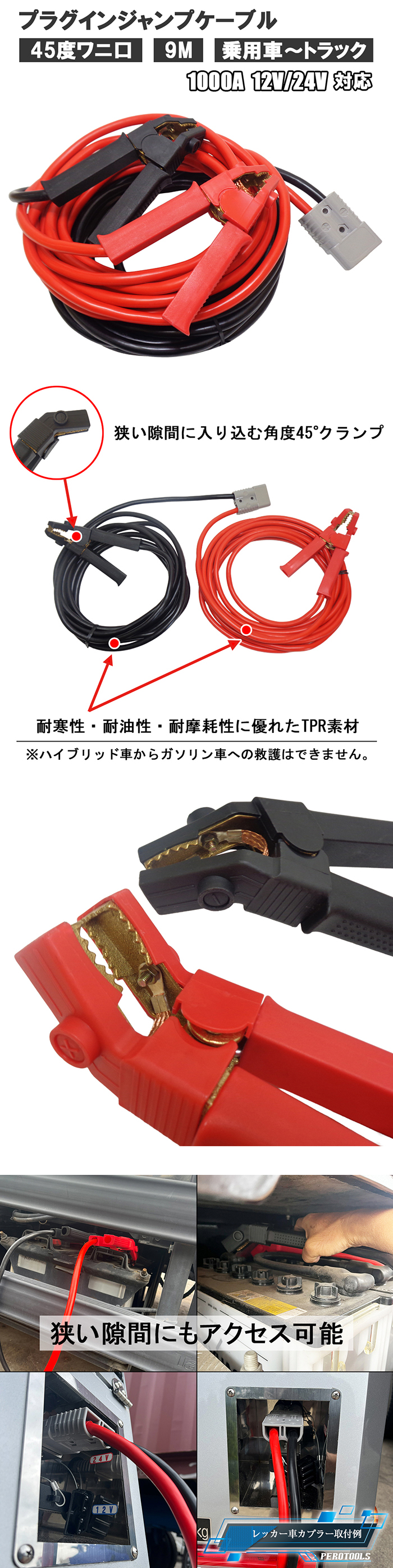 プラグイン式 プラグインジャンプケーブル ジャンプスタートケーブル 45度クランプ 1000A 12V/24V対応 ロングケーブル 9M 乗用車〜大型トラック ジャンプスターター レッカ